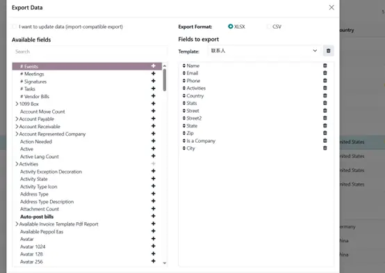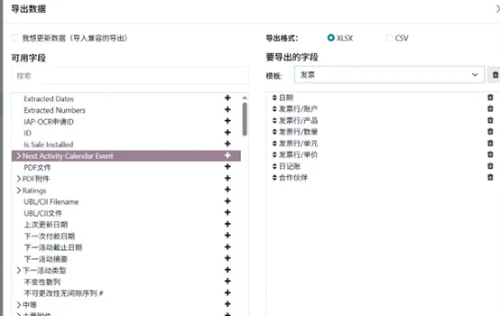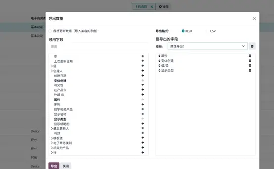 - 选择导出,在弹出窗口中,将左侧可用字段添加到右侧待导出字段。
