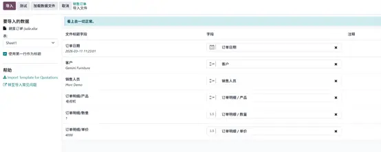 - 回到销售订单列表 → 操作 → 导入记录,上传文件。