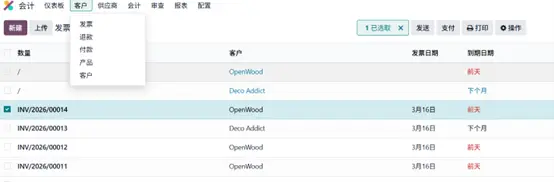 - 打开【会计】模块 → 客户 → 发票。