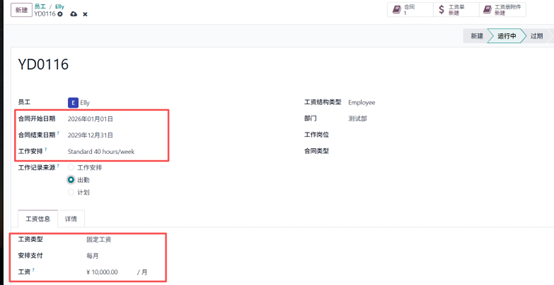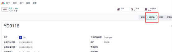 员工创建完成后,下一步至关重要的是创建员工合同。在 Odoo 18 中,合同用于定义雇佣条款,例如员工岗位、工作排班、薪资结构与雇佣期限。没有有效的合同,薪资系统将无法计算薪资或生成薪资单。