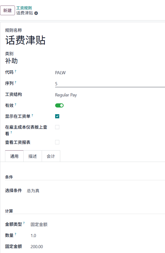 现在可以访问新建的薪资规则,金额类型可设置为固定金额或百分比。根据所选类型,可以输入具体固定数值或百分比。此外,还可以定义数量,系统将据此参与薪资计算。