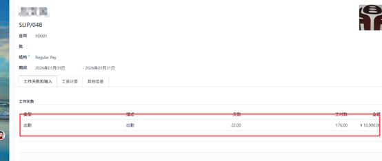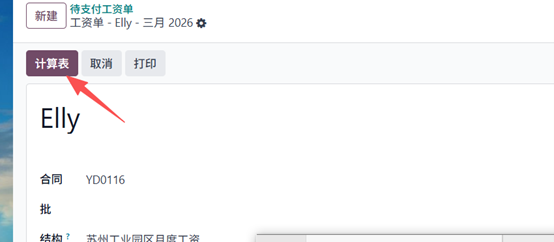 处理薪资单时,选择员工后,相关合同将自动更新。随后你可以选择合适的薪资结构,并指定需要发放薪资的月份。在薪资行中,如果类型设置为「考勤」,点击「计算薪资表」按钮后,系统将自动扣除员工休假天数对应的薪资。