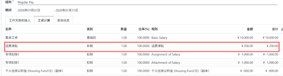 还可以看到我们添加的自定义规则(如话费补贴)已显示在薪资计算行中。这表明规则已正确应用,并纳入薪资单计算。