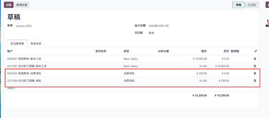 现在你可以查看已生成的会计凭证,其中包含交通补贴对应的借贷科目及金额。凭证过账后,相关科目将同步更新,并在会计账簿中反映该笔薪资交易。