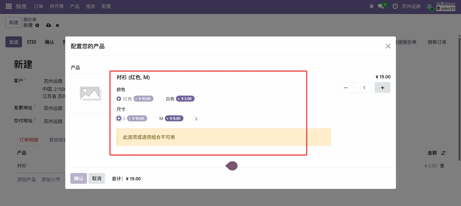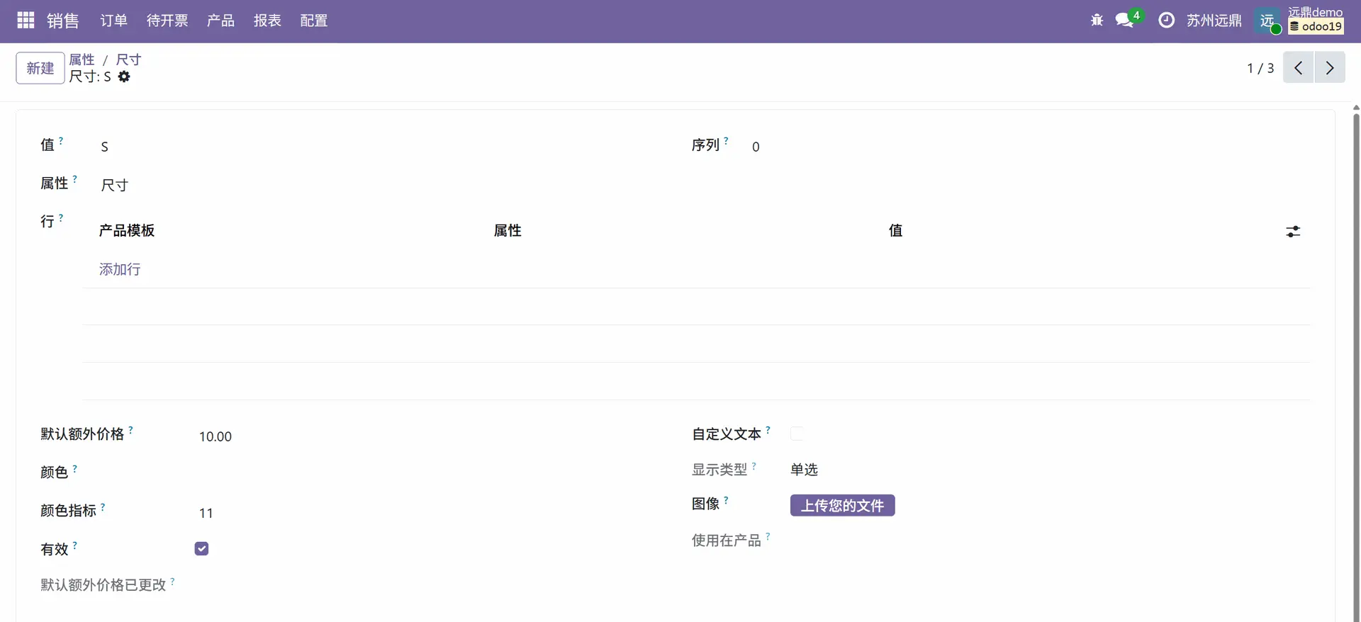 产品变体(Variant) 则是由一组特定属性值组合而成的产品具体配置。代表某一 “属性值集合对应的产品实例”。例如,“红色、中号、棉质的衬衫”,就是 “衬衫” 这款产品的一个变体。在 Odoo 19 中,用户可先创建产品属性,再基于属性配置出不同的产品变体。