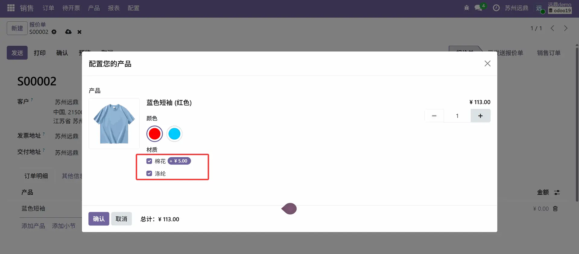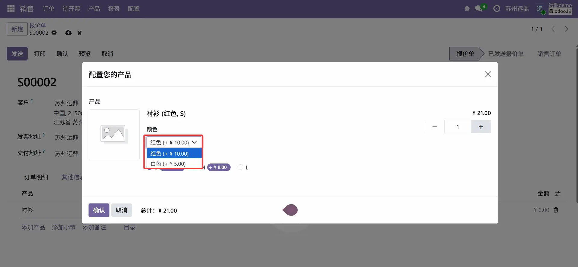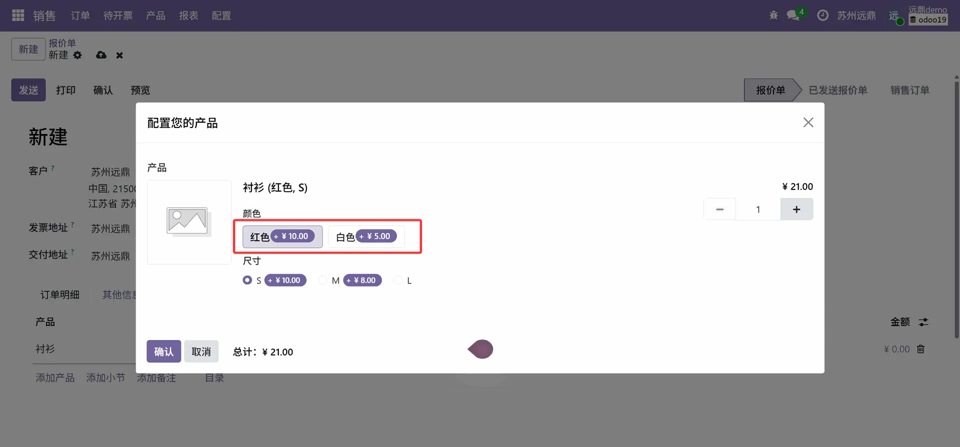 要查看不同显示类型的用法,请创建一个包含带有此已创建属性的产品的销售订单(Sale Order)。创建销售订单时,每当选择该产品时,都会显示一个弹出窗口,其中可见显示类型的视图,此弹出窗口包含所有属性值。在那里,可以选择任何需要的属性,并且也会显示附加价格。