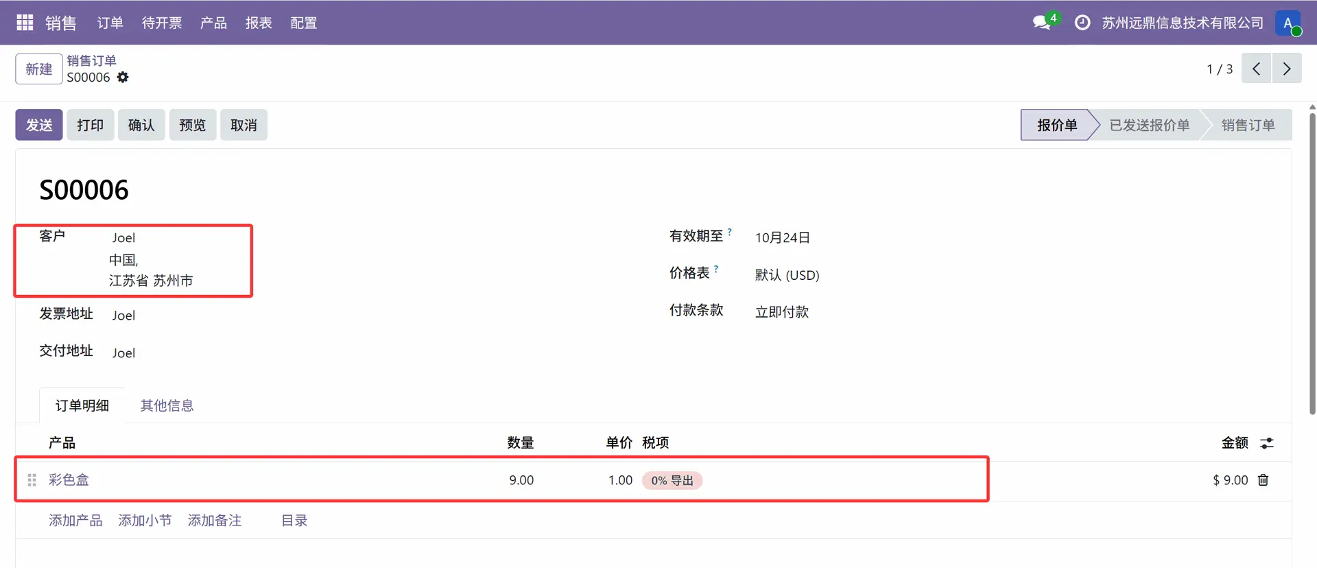 在新窗口中,选择您的客户,然后在"订单行"选项卡下选择产品"彩色盒"。输入产品数量并保存更改。