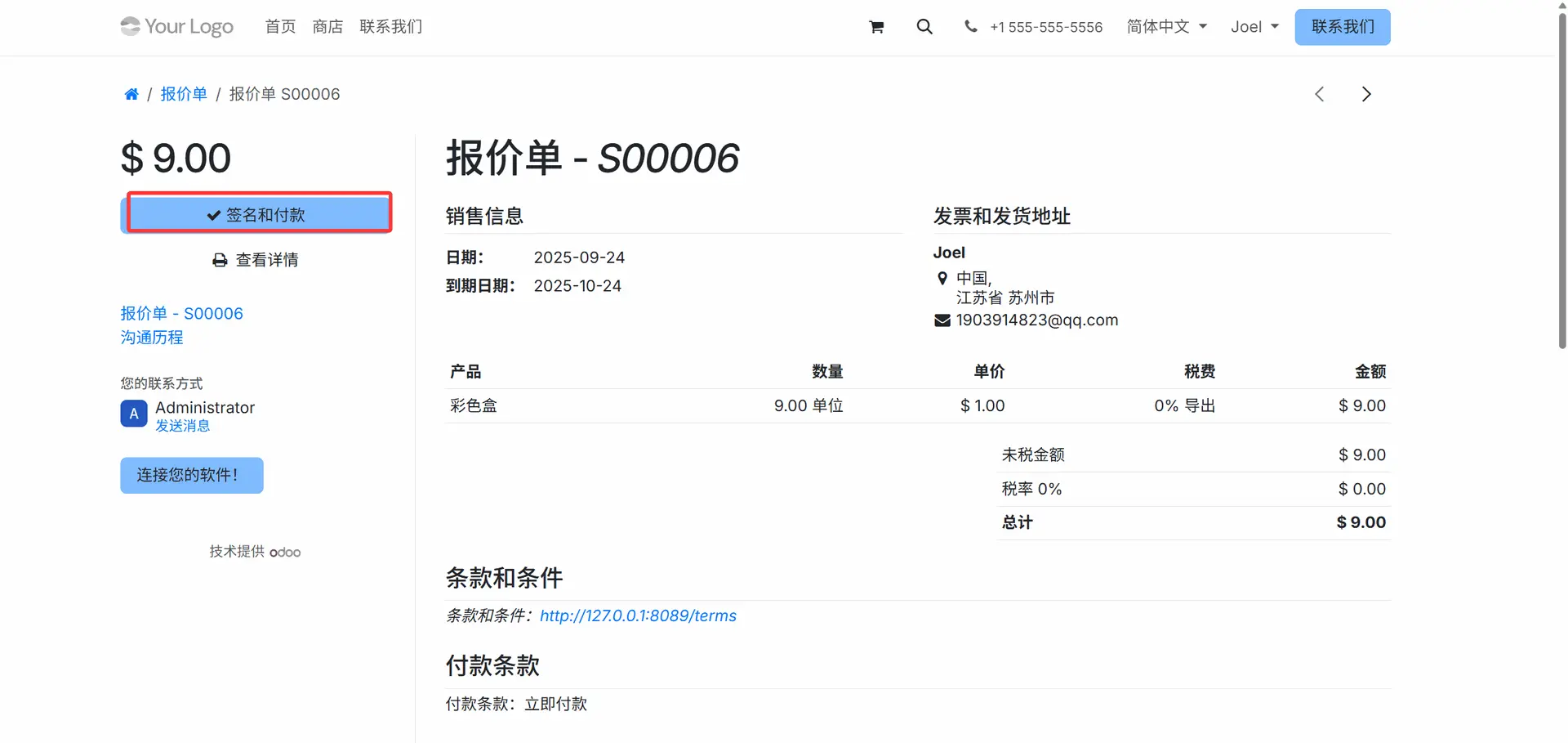客户在接受报价单后,可以通过客户门户轻松完成支付。门户页面会显示基本的报价单详情,例如到期日、报价日期、发票地址和收货地址。要完成商品付款,客户只需点击"签名和付款" (Sign & Pay) 按钮。