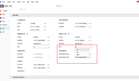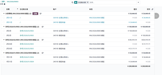 系统中设有专门的递延分录日记账与递延收入科目。递延分录既可以手动创建并分组,也可以在账单审核时自动生成。分录的计算方式支持按天数、月份、整月三种模式。