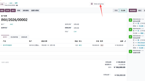 2. 创建新发票,客户仍为AMC,产品为订阅计划,设置递延期间为 2026 年 3 月 1 日至 2026 年 6 月 30 日,开票日期为 3 月 30日,确认发票。