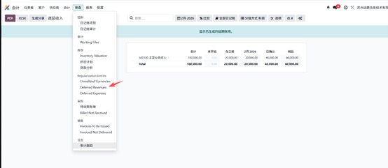 Odoo 提供了递延收入报表,用于生成并查看递延分录,该报表位于「调整分录」模块下。在审核菜单中选择递延收入报表即可打开。