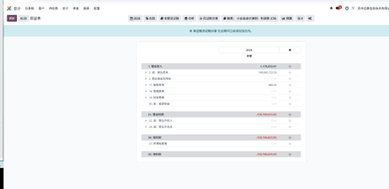 7. 净利润(Net Profit):利润表最终展示的是所有收入扣除所有支出后的净额,即净利润。Odoo 通过汇总所选报告期内的所有入账数据计算该指标。该指标是评估企业业绩、制定投资决策或编制未来预算的核心依据,能直观反映企业真实盈利或亏损情况。