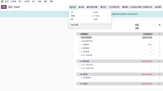 进入利润表界面后,系统会根据默认时间段(通常为当前会计年度)自动生成报表。不过,Odoo 提供了高度灵活性,用户可根据企业特定需求修改该时间范围。用户可选择按月、季度、年或自定义时间生成报表。
