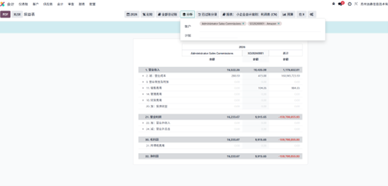 用户可基于分析科目(Analytic Account)和分析计划(Analytic Plans)对报表进行筛选。