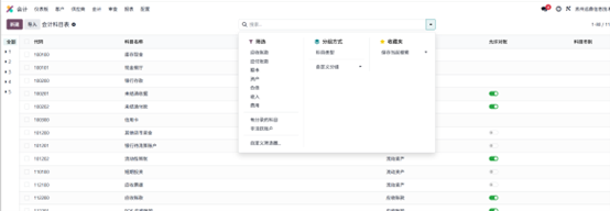 为了提升科目查找的便捷性,Odoo预置了多个筛选条件,包括应收、应付、资产、负债、收入、费用、权益,用户可快速定位特定类别的科目。除了这些预置筛选器,用户还可以设置自定义筛选条件,并根据不同维度对科目进行分组,无需导出至外部电子表格,就能灵活地拆分财务数据、开展高效分析。