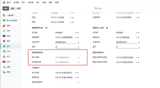 提前付款折扣功能,可帮助企业自动核算发票在约定付款到期日前完成结算产生的财务影响。在Odoo 19会计模块中,通过专门的默认科目配置,该流程可实现全自动化,用于记录提前付款结算产生的收益或损失。