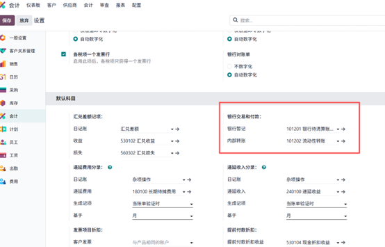 在Odoo 19会计模块中,银行交易与付款的配置项包含了默认清算科目,这类科目能够保障银行对账工作的准确、有序开展。在对账流程中,这类科目作为临时归集账户,在交易与对应会计分录完成全额匹配前,对交易进行暂记管理。