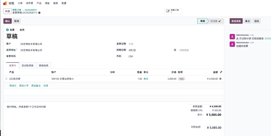 输入折扣信息后,点击【确认】按钮完成销售订单的确认。此时报价单将转为已确认订单,进入开票与发货流程。
