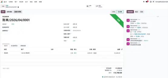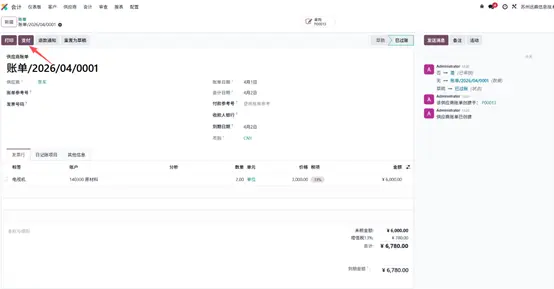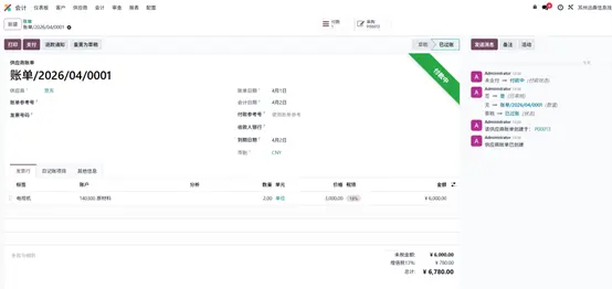 - 核对供应商信息、发票行、税金、付款条件等内容无误后,点击确认按钮,账单完成过账,进入待付款状态。