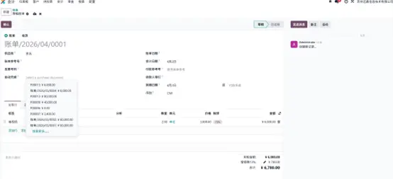 - 导航至会计模块,打开供应商菜单,选择账单,点击新建按钮创建供应商账单;