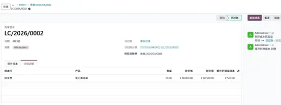 验证到岸成本后,附加费用将分摊至已入库数量。本例采用平均分摊,总到岸成本 500 元由 10 台均摊,每台增加 50元成本,产品单位成本变为 5050 元。