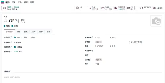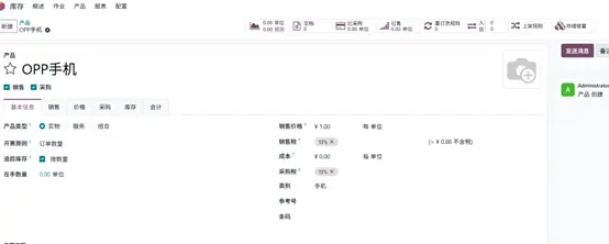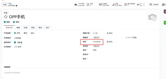 创建新产品“OPP手机”,初始无成本。