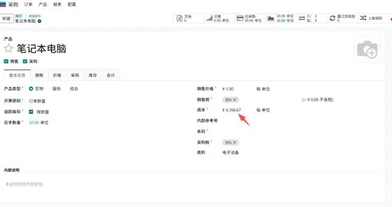 以笔记本电脑为例,初始未设置成本。