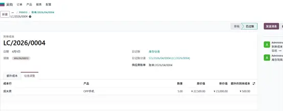 产品入库后,创建供应商账单,并添加已设置好的到岸成本服务产品。