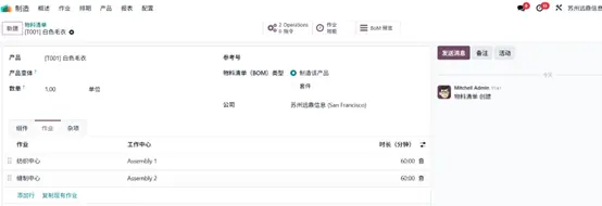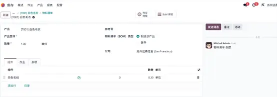 点击智能菜单中的 物料清单(Bill of Materials) 选项,系统将弹出新窗口,展示为 “白色毛衣” 产品创建的物料清单,可直接用于生产。组件(Components) 选项卡中列示了生产该产品所需的全部原材料,本例中原材料库存充足,可满足大批量生产需求。