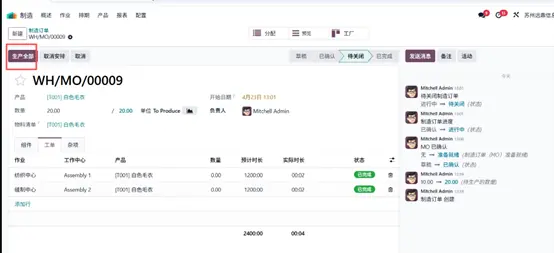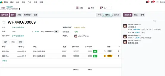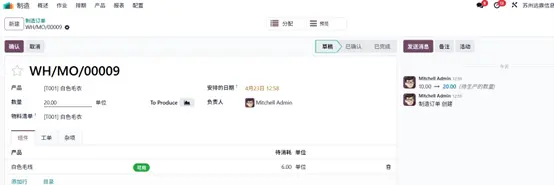三位客户对同一产品提出了不同数量的采购需求,基于此,企业决定启动该产品生产。返回生产模块开始生产流程,在 数量(Quantity) 字段中录入 “白色毛衣” 产品生产数量 20 件,系统将自动更新对应物料清单信息。
