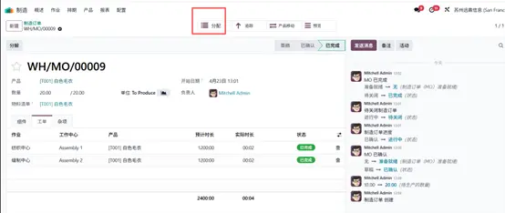 至此生产流程全部结束,点击 分配(Allocation) 智能按钮即可查看物料分配报表。