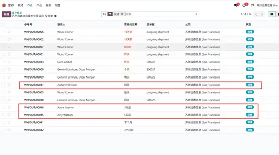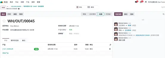 在物料分配报表中点击任意交货单,可进入对应单据详情页,此时选中的订单状态已更新为待发货(Ready)。点击 确认(Validate) 按钮完成发货操作,产品将从库存出库并交付至客户。