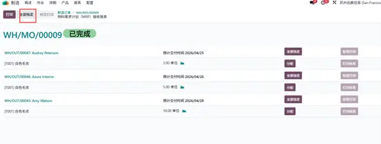 系统将弹出新窗口,展示所有已创建的交货单信息,包括分配申请明细,如交货单编号、客户名称、预计交货日期及需求数量等。点击 全部分配(Assign All) 按钮,将产品库存分配至所有交货订单。