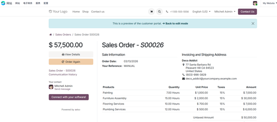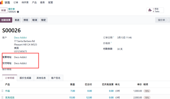 如果客户的联系人记录中已保存这些地址,Odoo 会**自动带出**,也可手动选择其他联系人或地址。