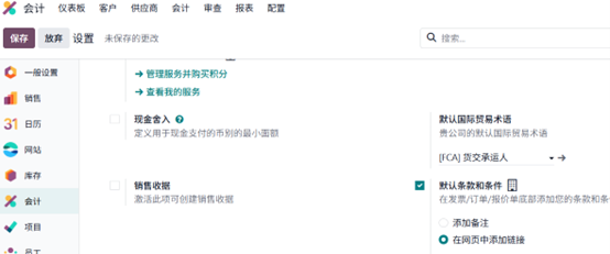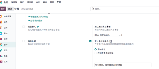 Odoo 19 支持直接在会计模块设置**默认贸易术语**,每张新发票、账单、销售单据都会自动带出,减少手工录入并避免错误。