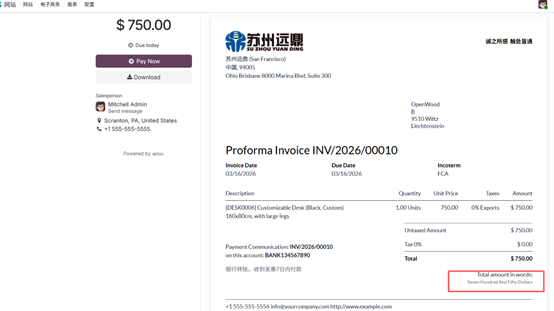 Odoo 19 支持**发票金额大写**功能,让发票更清晰、规范、正式,可避免金额误解,满足银行或法定要求。