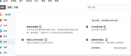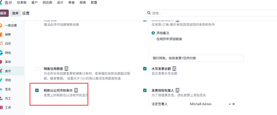 2. 在 **客户发票** 区域,启用 **本位币显示税金**