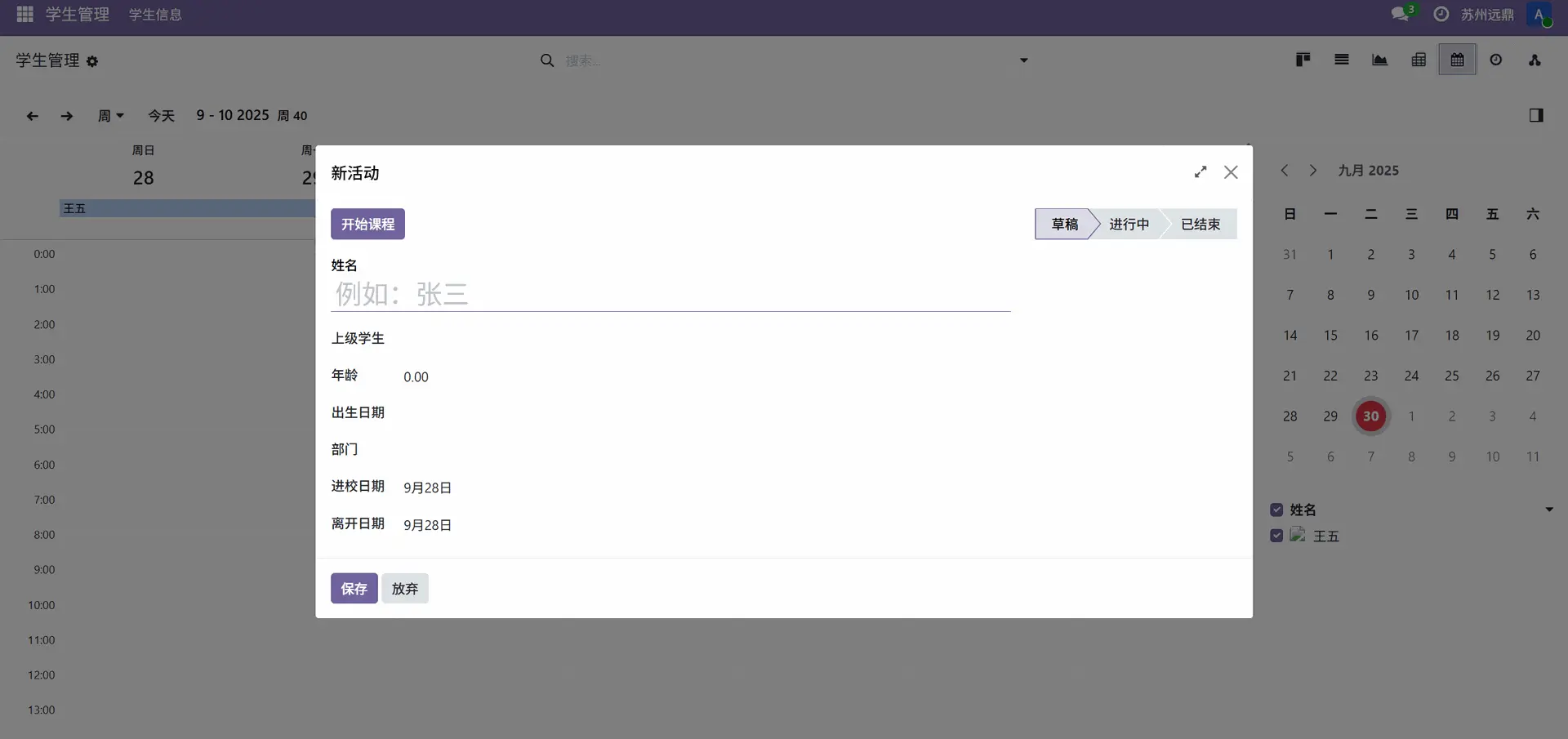 首先定义日历视图所需的模型和相关字段。定义好这些字段后,下面是该模型的表单视图示例。