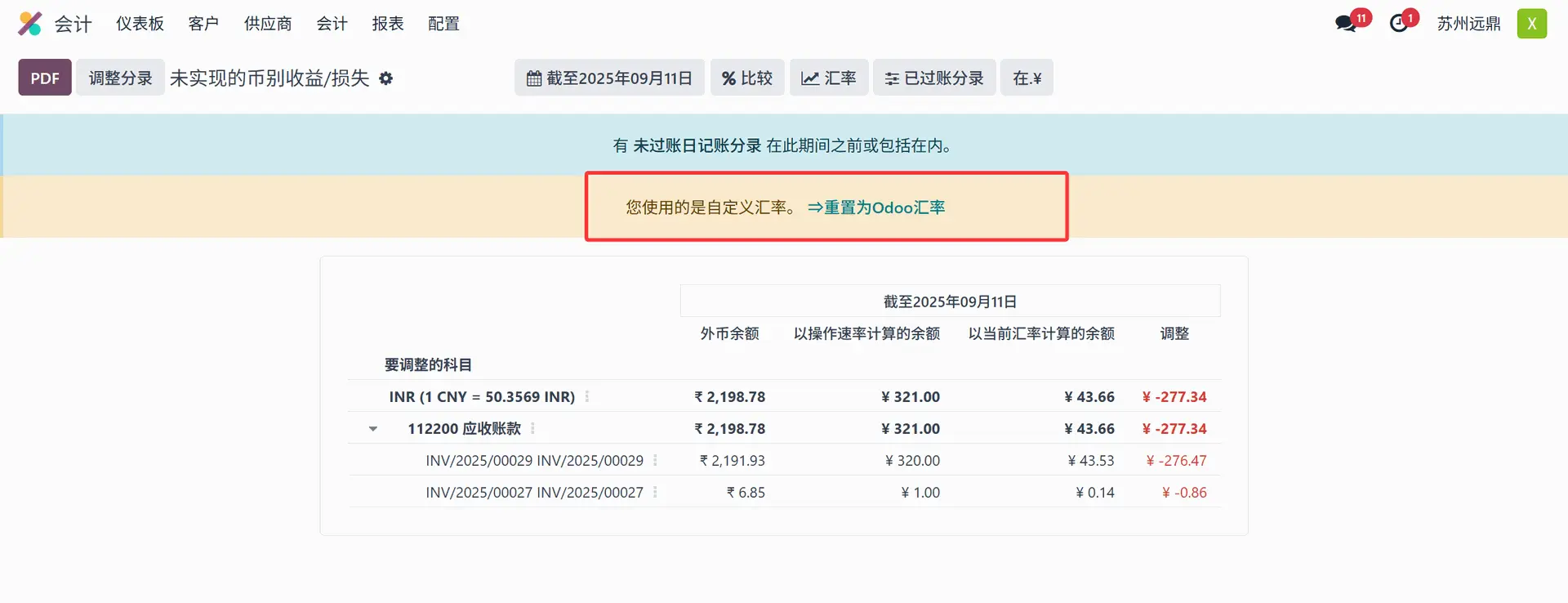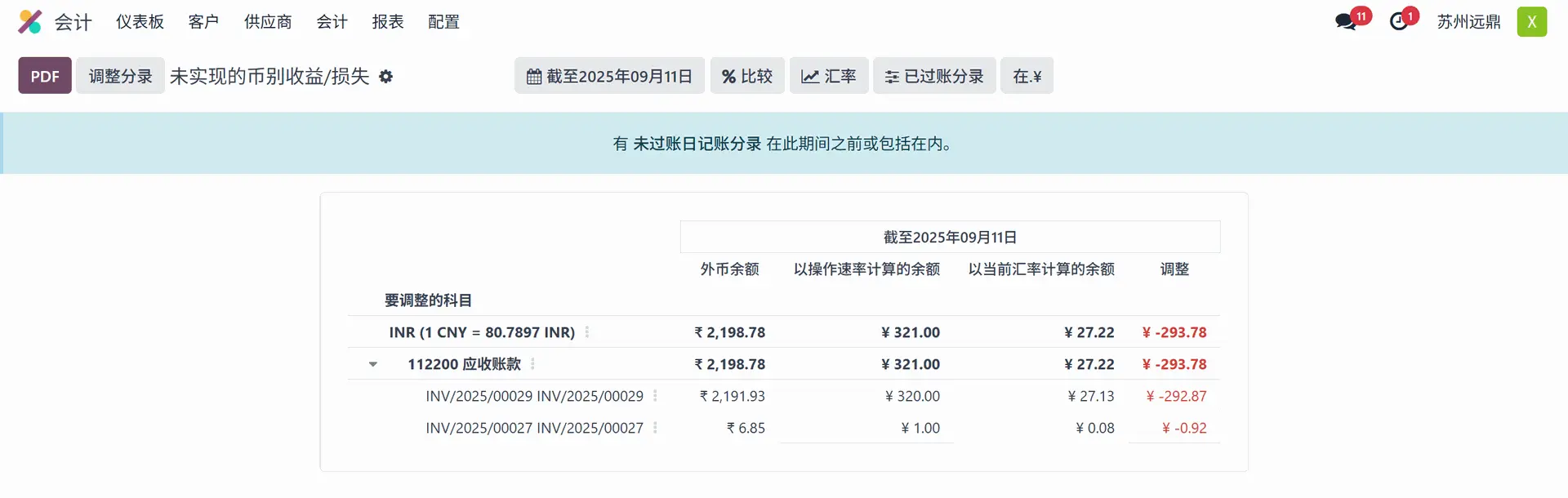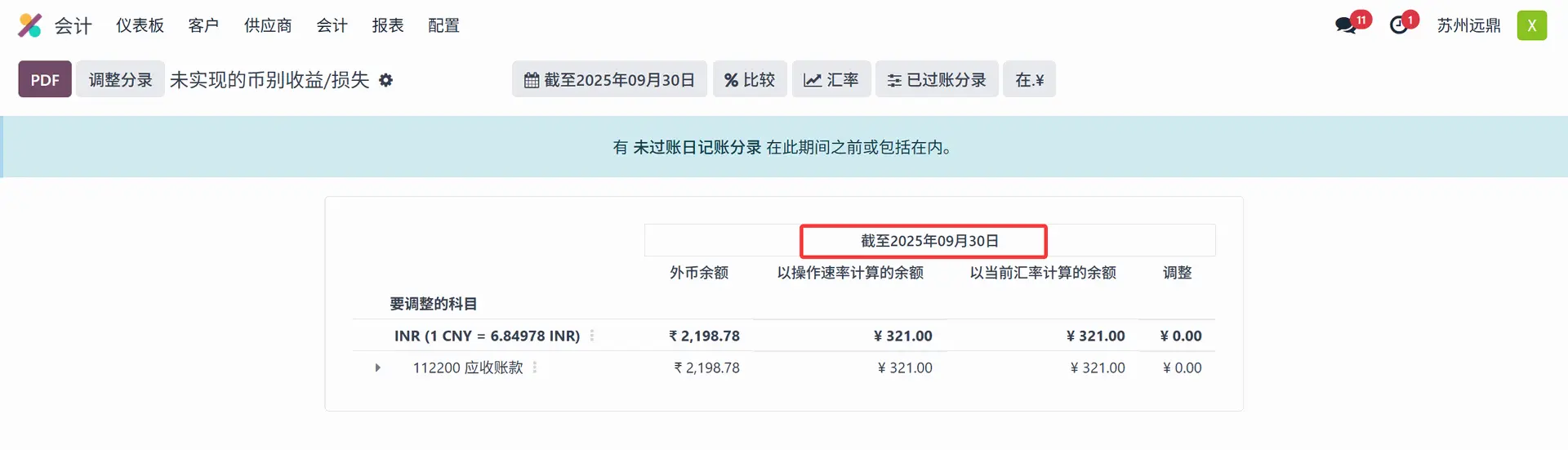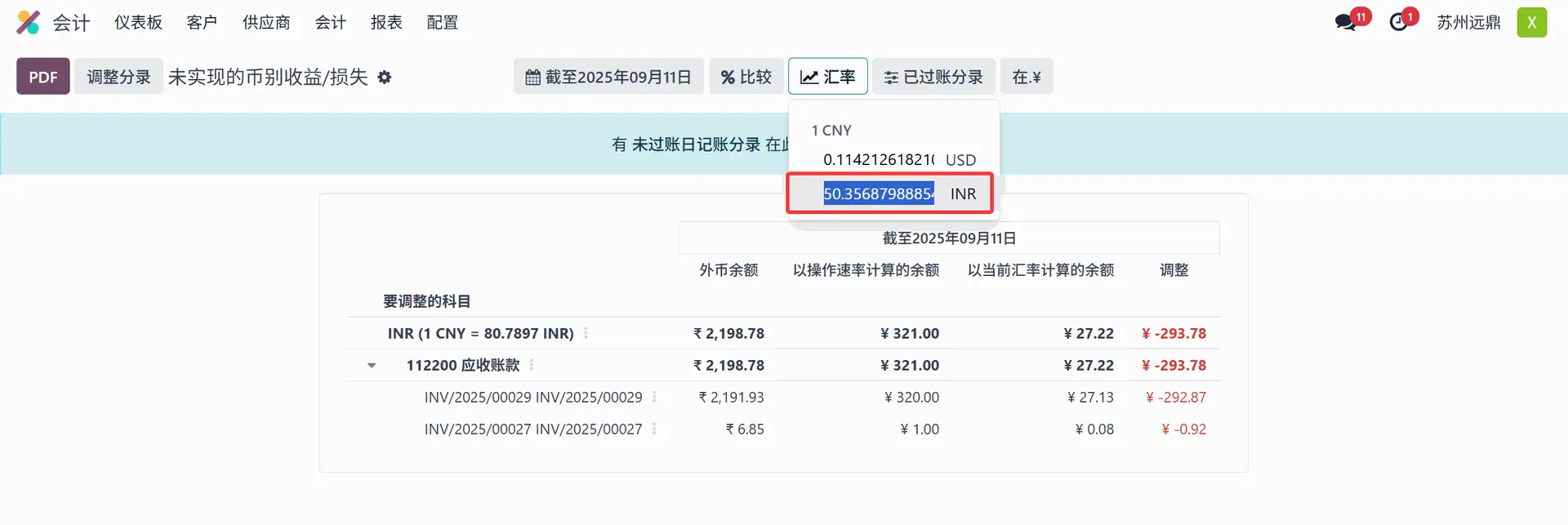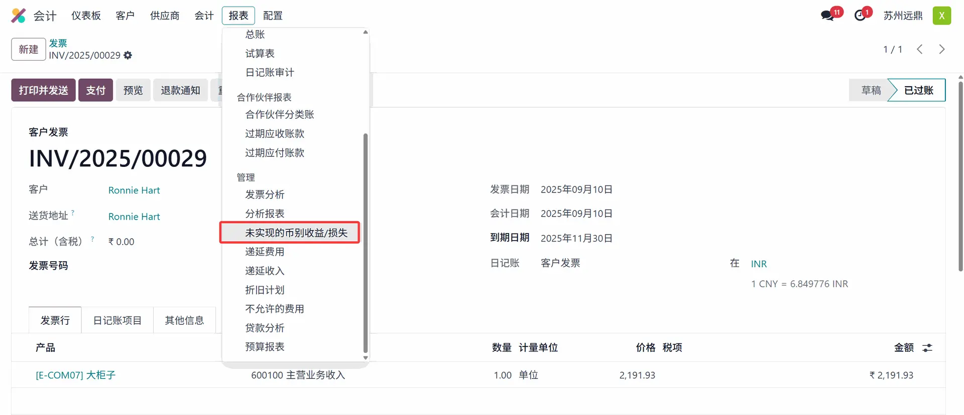 假设存在一位印度客户,用户在发票日期后设定了3个月的付款期限,期间汇率可能发生变动,Odoo 19 通过未实现损益报告管理该类变动,具体步骤如下: