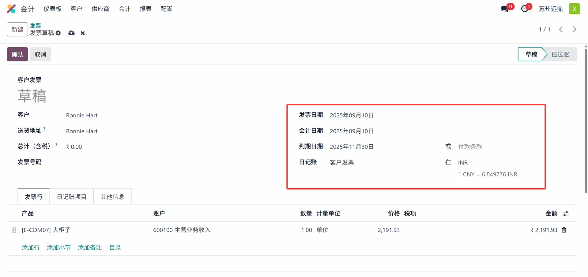 步骤 1:创建外币客户发票(以 INR 印度卢比为例)