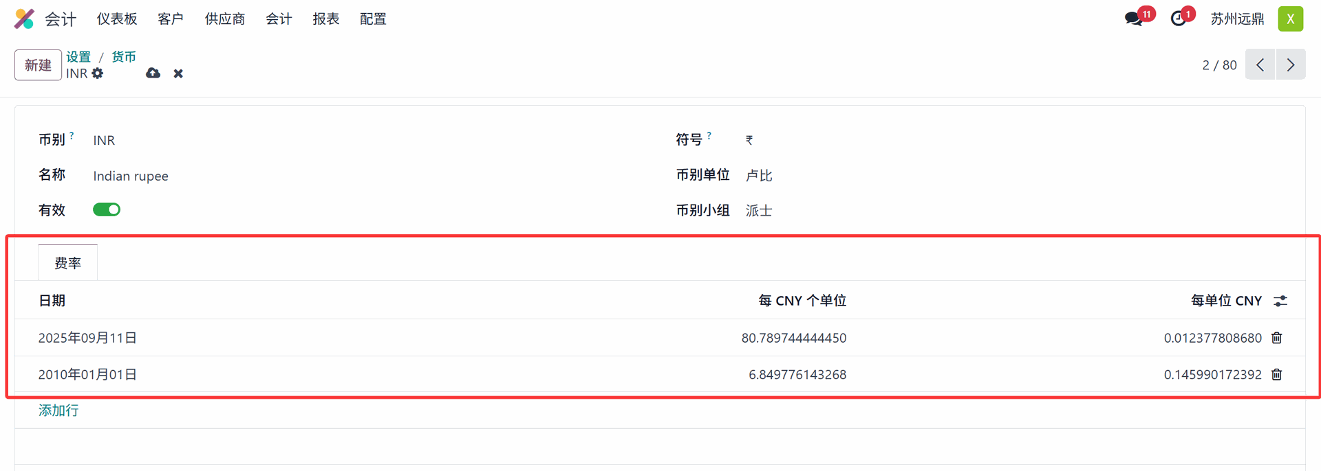 - 操作路径:配置(Configuration)> 币别(Currencies)> 选择印度卢比(INR)> 点击「添加汇率(Add Rate)」