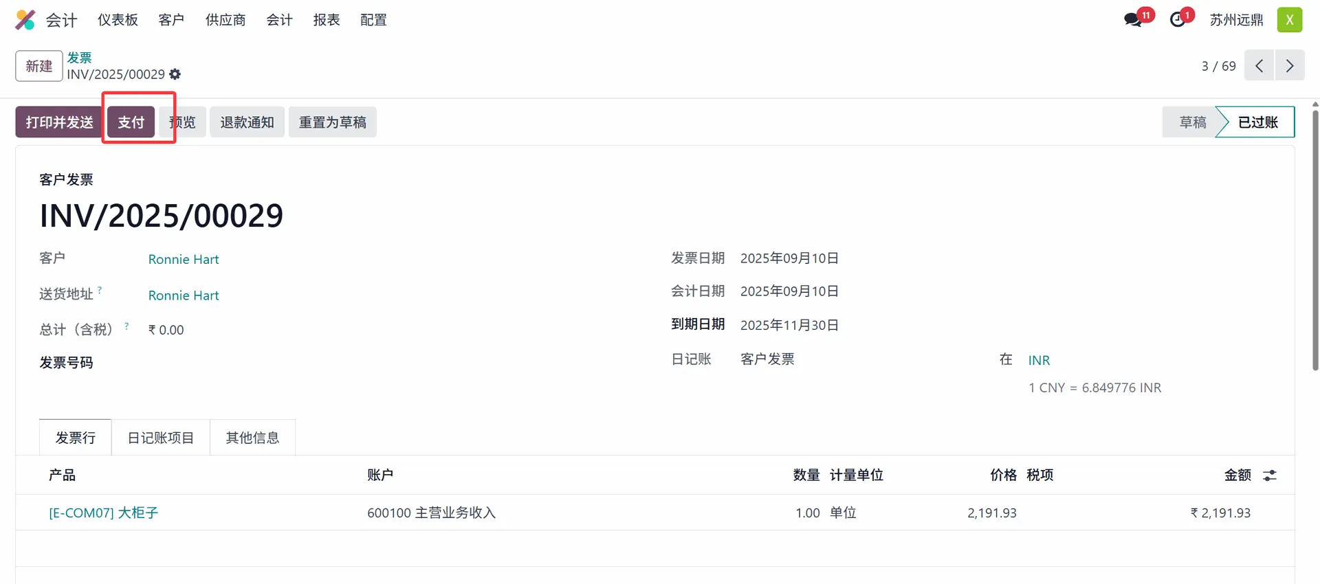 - 找到已创建的印度客户发票,点击「支付(Pay)」按钮