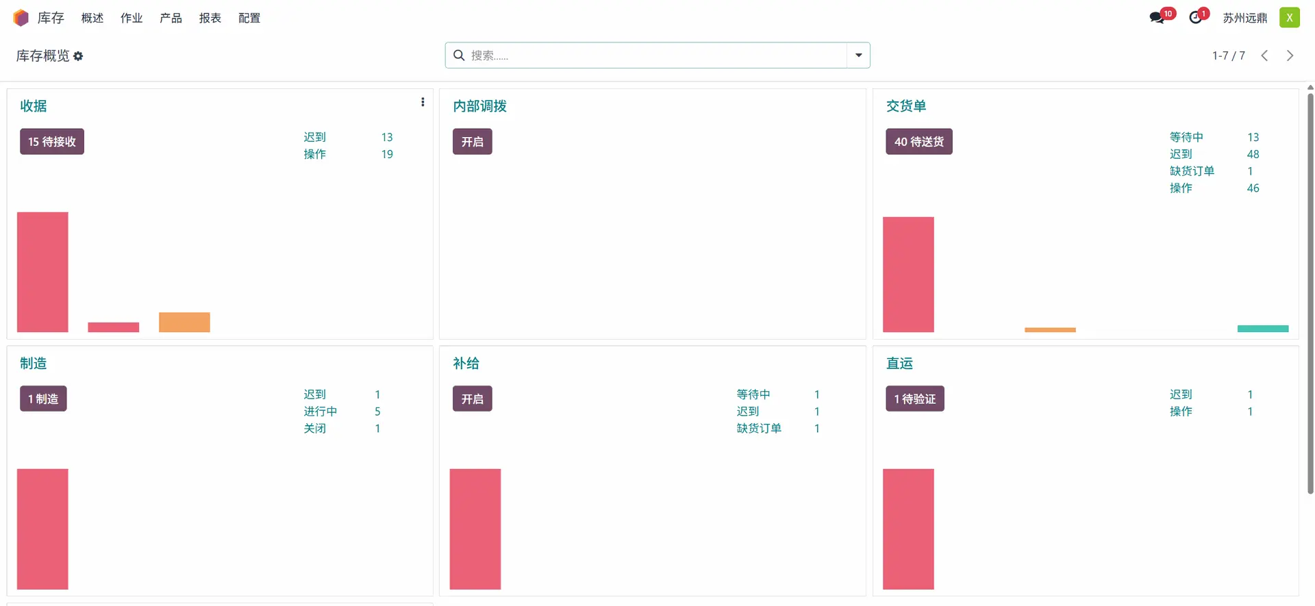 用户可以使用“概览”菜单的“库存概览”面板管理收货、内部调拨、交货单、生产、补给、POS订单、维修、直运和外包等。每个作业类型组中未完成任务的数量会显示出来。