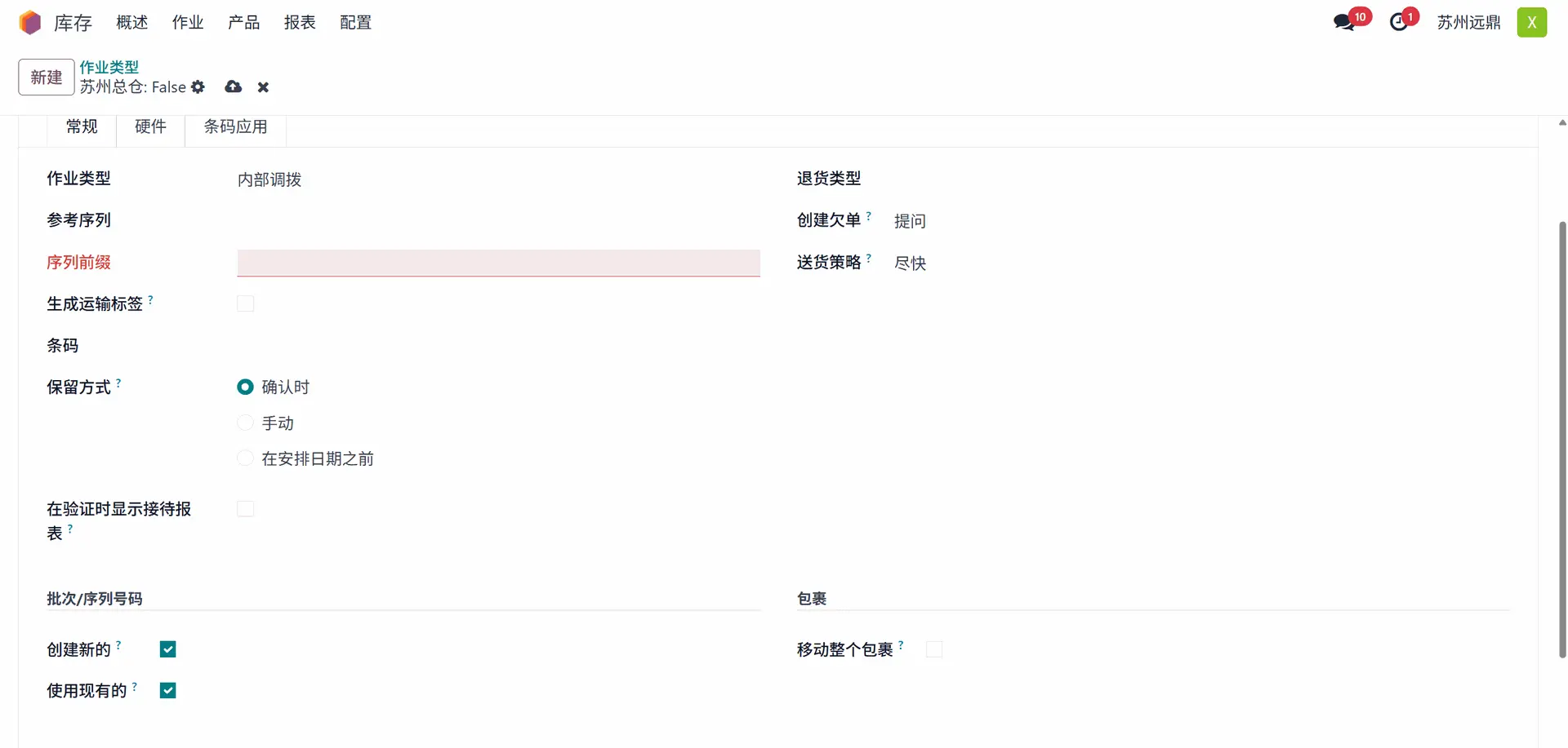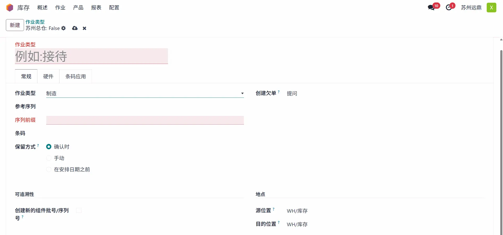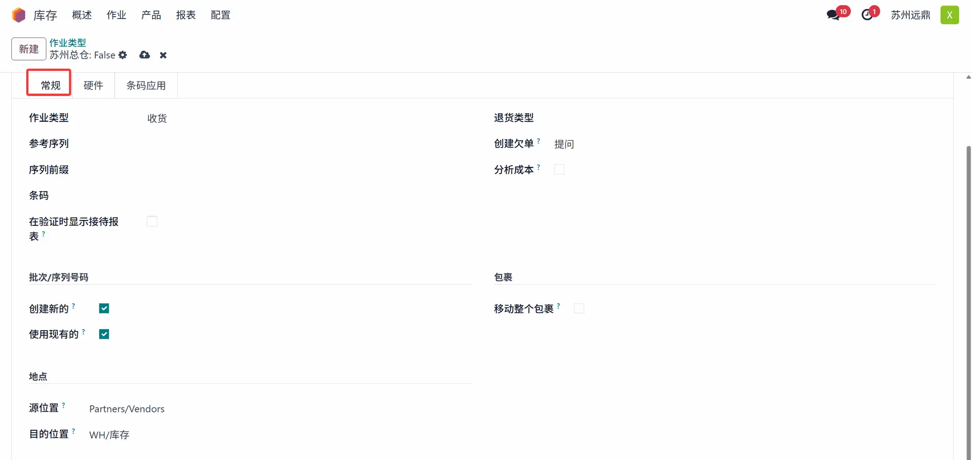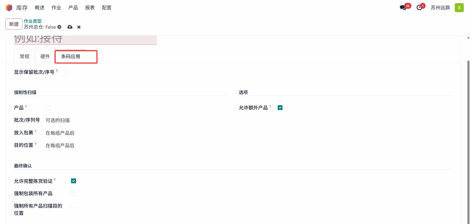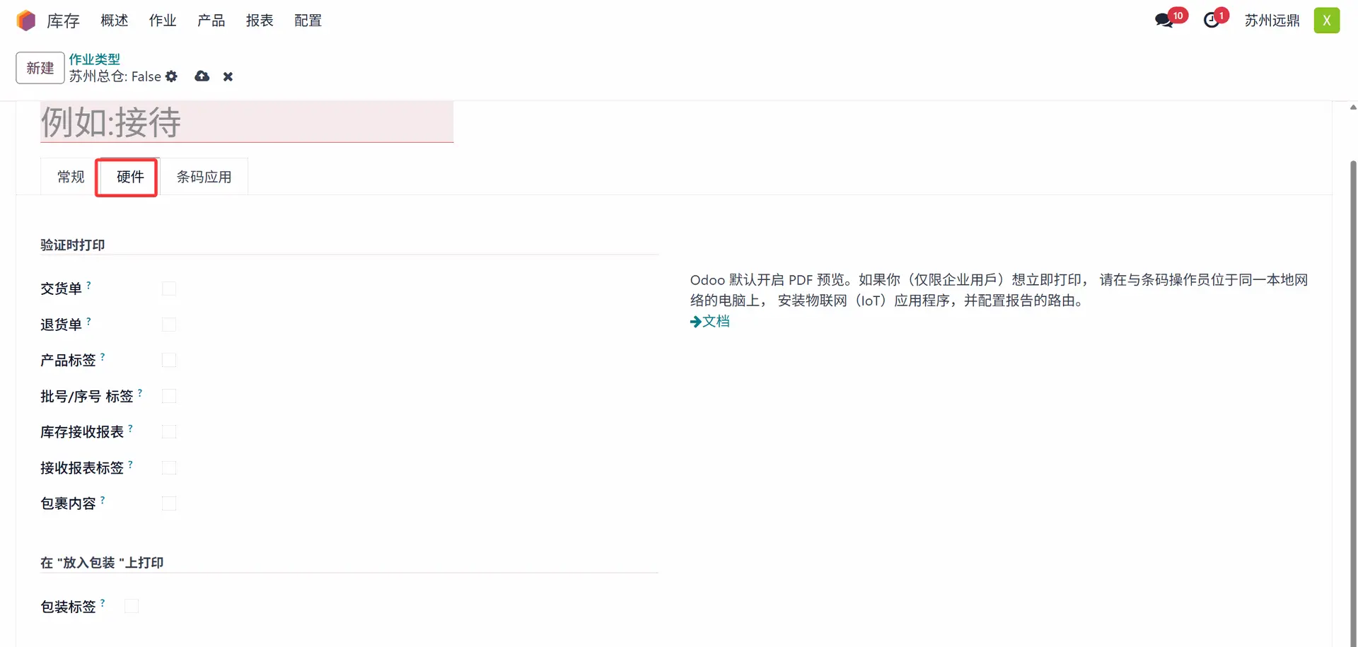 首先,在“作业类型”字段中更改操作的名称。在此配置表单中,Odoo 新增了一个“硬件”选项卡部分。因此,可见“常规”、“硬件”和“条码应用”选项卡。