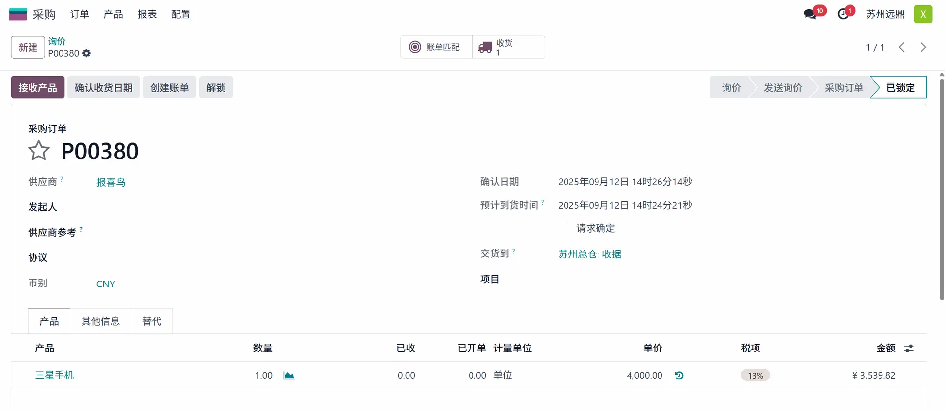 然后,可以接收产品并为此订单创建账单。要接收订单中的产品,点击“接收产品”按钮并验证收货单。转到询价单,会出现“创建账单”按钮,以便用户为采购订单创建账单。