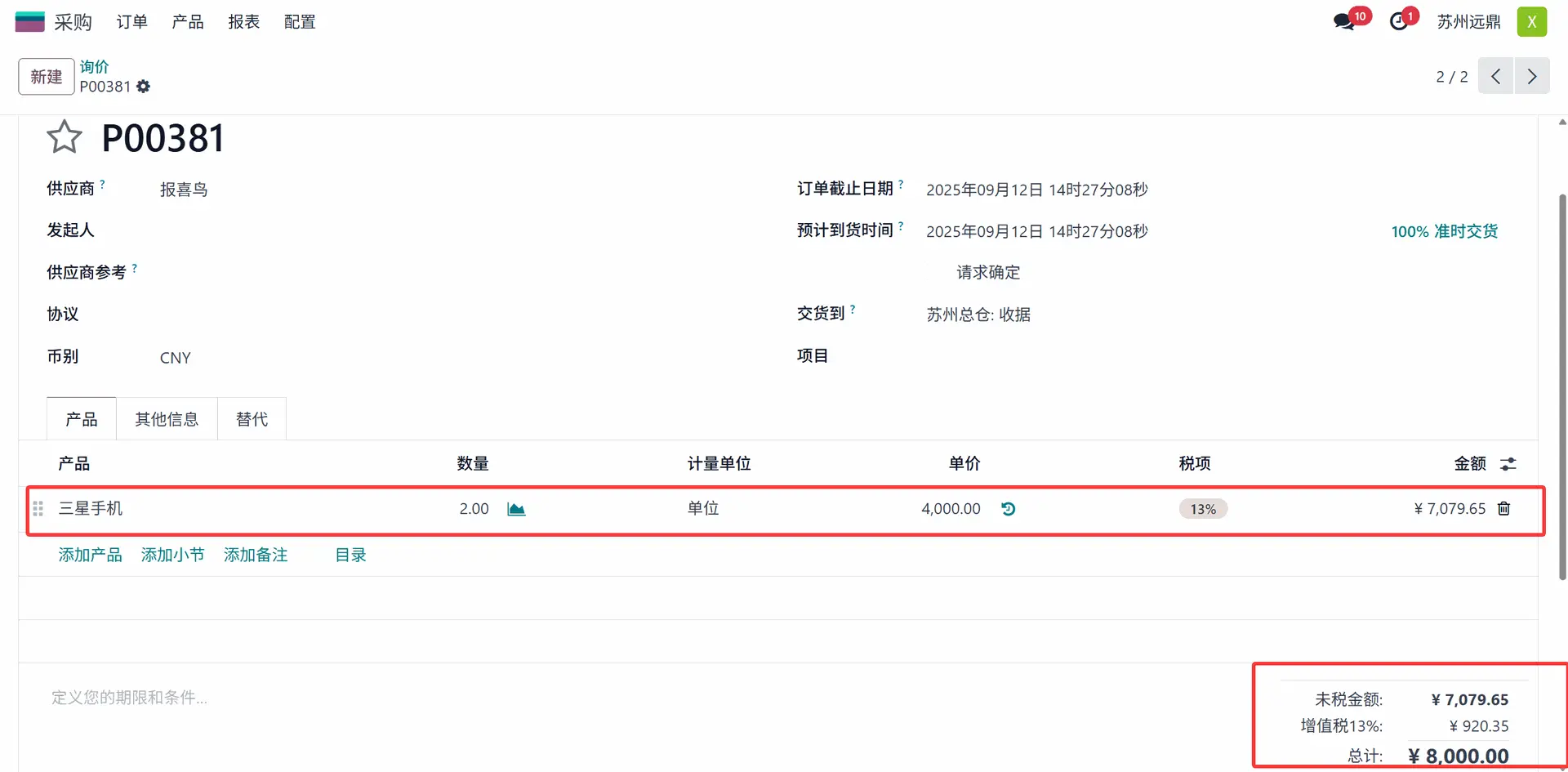 此采购订单的金额为 8000人民币。将订单详细信息添加到询价单后,点击“确认”按钮并确认采购订单。