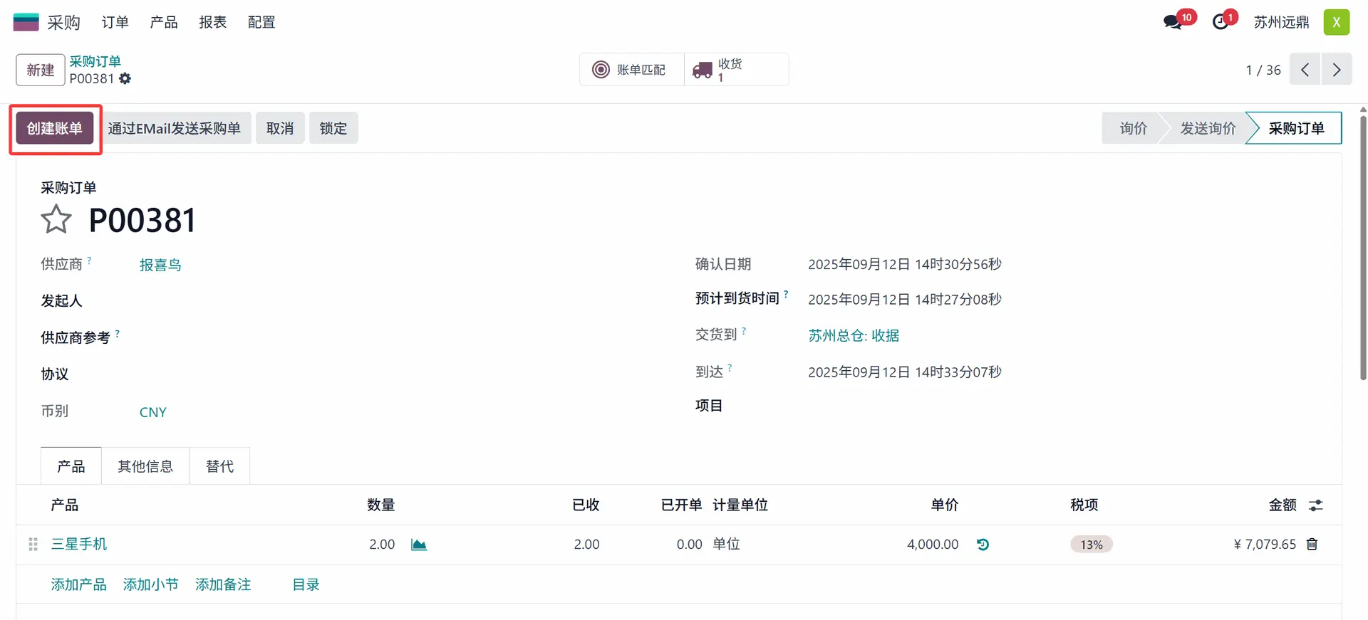 下一步是为采购订单创建账单。要创建账单,请点击采购订单中的“创建账单”按钮。