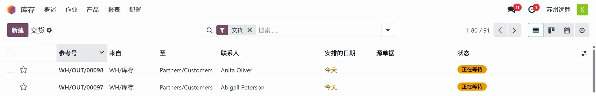 为不同客户创建了两个交货订单,他们都请求同一产品,但该产品在公司库存中不可用,因此交货调拨处于“等待”状态。