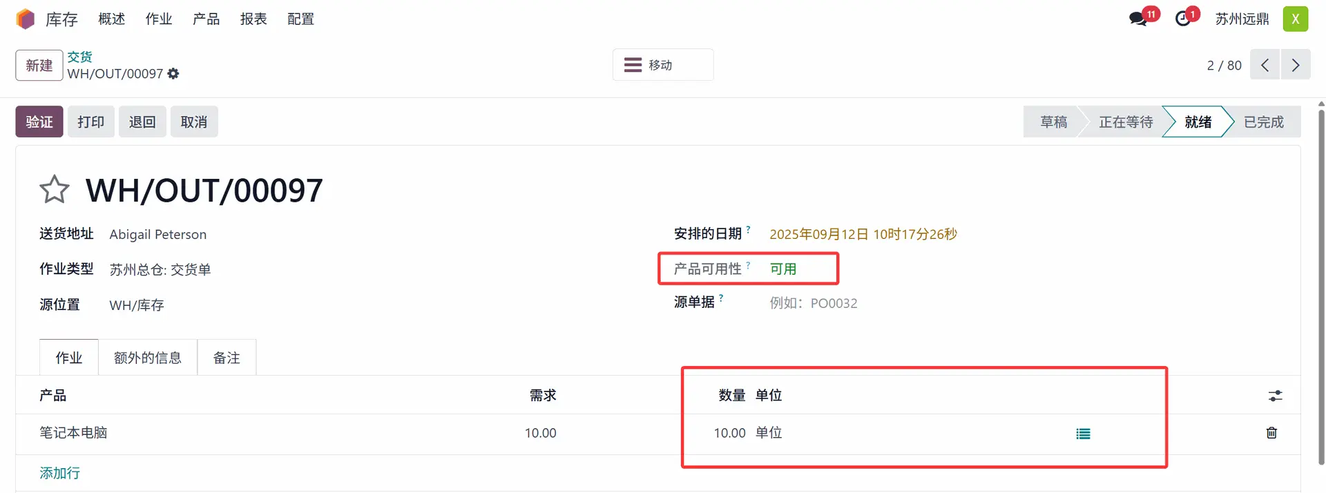 第一个交货调拨是为名为 Abigail Peterson 的客户创建的。该客户需要 10 台笔记本电脑。点击“标记为待办”按钮。