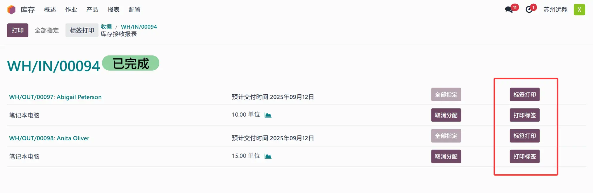 收货阶段将变为“完成”,调拨完成,产品到达库存位置。如下面的截图所示,将会出现一个名为“分配”的智能选项卡。